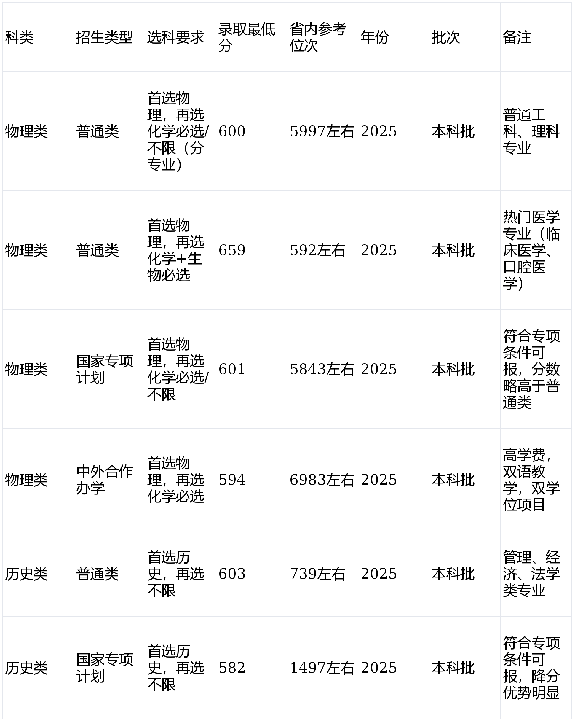 :物理类的临床医学、口腔医学、计较机科学取手艺、冶金工程、轨道交通信号取节制,汗青类的会计学、金融学、,2025年物理类通俗类最低600分、抢手医学专业659分,国度专项打算最低601分,中外合做办学最低594分;汗青类通俗类最低603分,国度专项打算最低582分,适配高分、中高分段考生,分数梯度清晰。