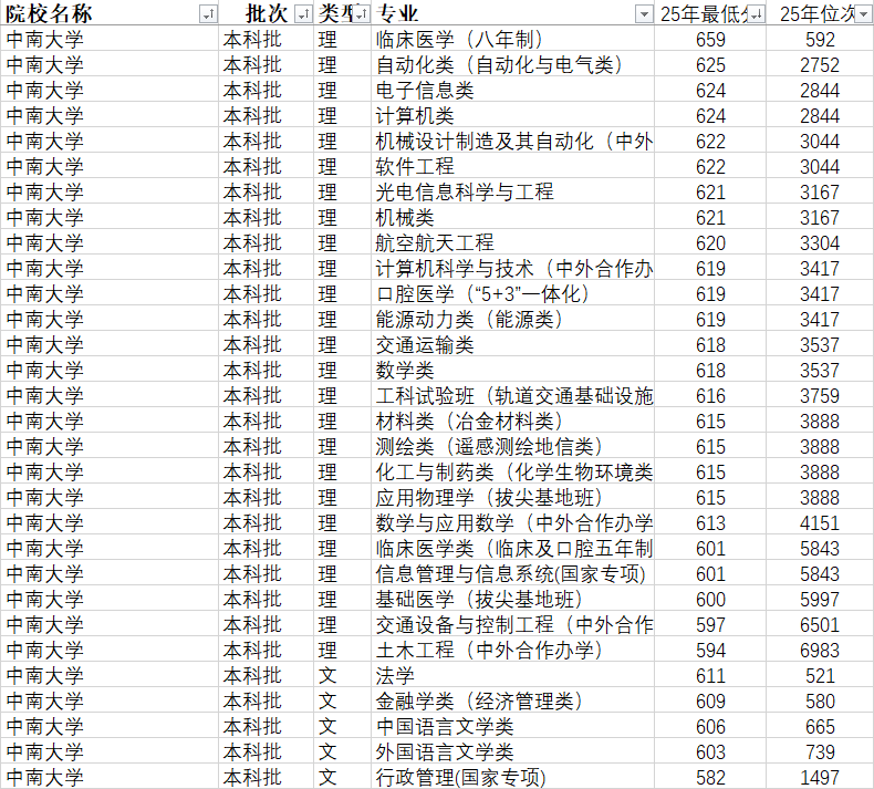 : 1。 医学类(湘雅王牌):临床医学、口腔医学、护理学、药学、医学查验手艺,此中临床医学(5+3一体化)、口腔医学是抢手专业,依托湘雅医学院的顶尖实力,就业间接对接三甲病院,登科分数常年位居全校前列; 2。 工学类(保守王牌):冶金工程、矿业工程、机械设想制制及其从动化、材料科学取工程、轨道交通信号取节制、土木匠程,均为国度级一流/特色专业,对接中国五矿、中国中车等央企,就业不变、薪资高; 3。 文管类:会计学、金融学、、行政办理,此中会计学注册会计师通过率达40%(全国平均15%),、金融学就业面广,适配国企、事业单元、金融机构。